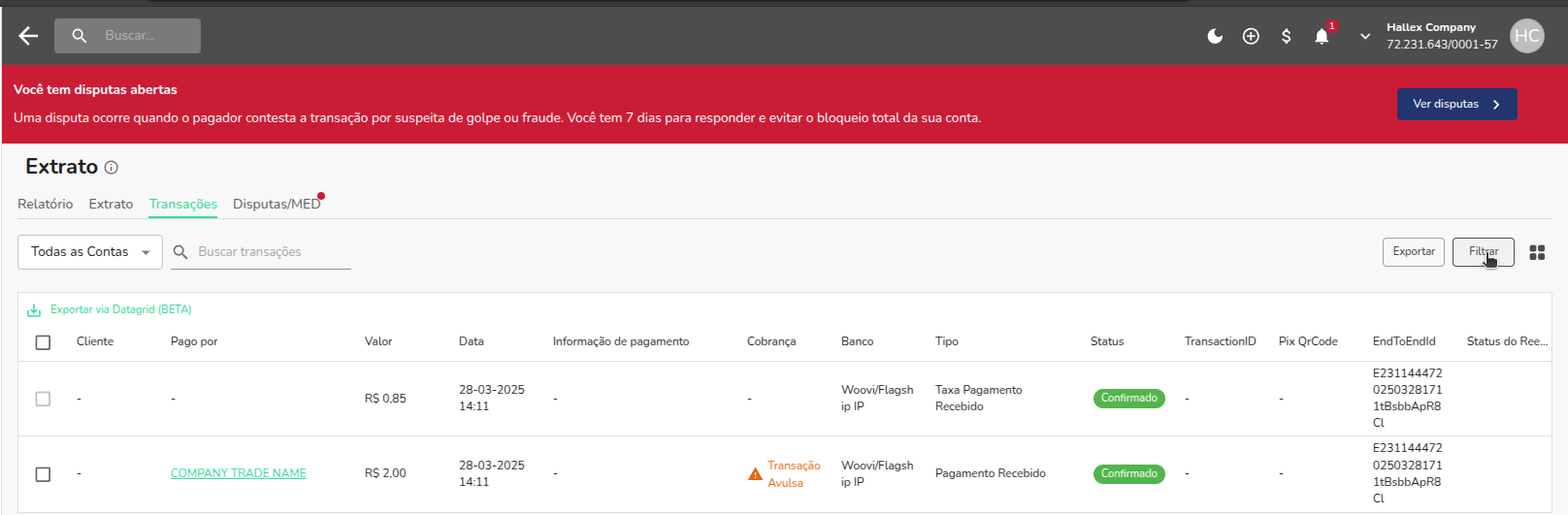 Para obter um endToEndId do tipo pix-in, vá ao dashboard, em "Extrato" localize a aba transações e clique nela