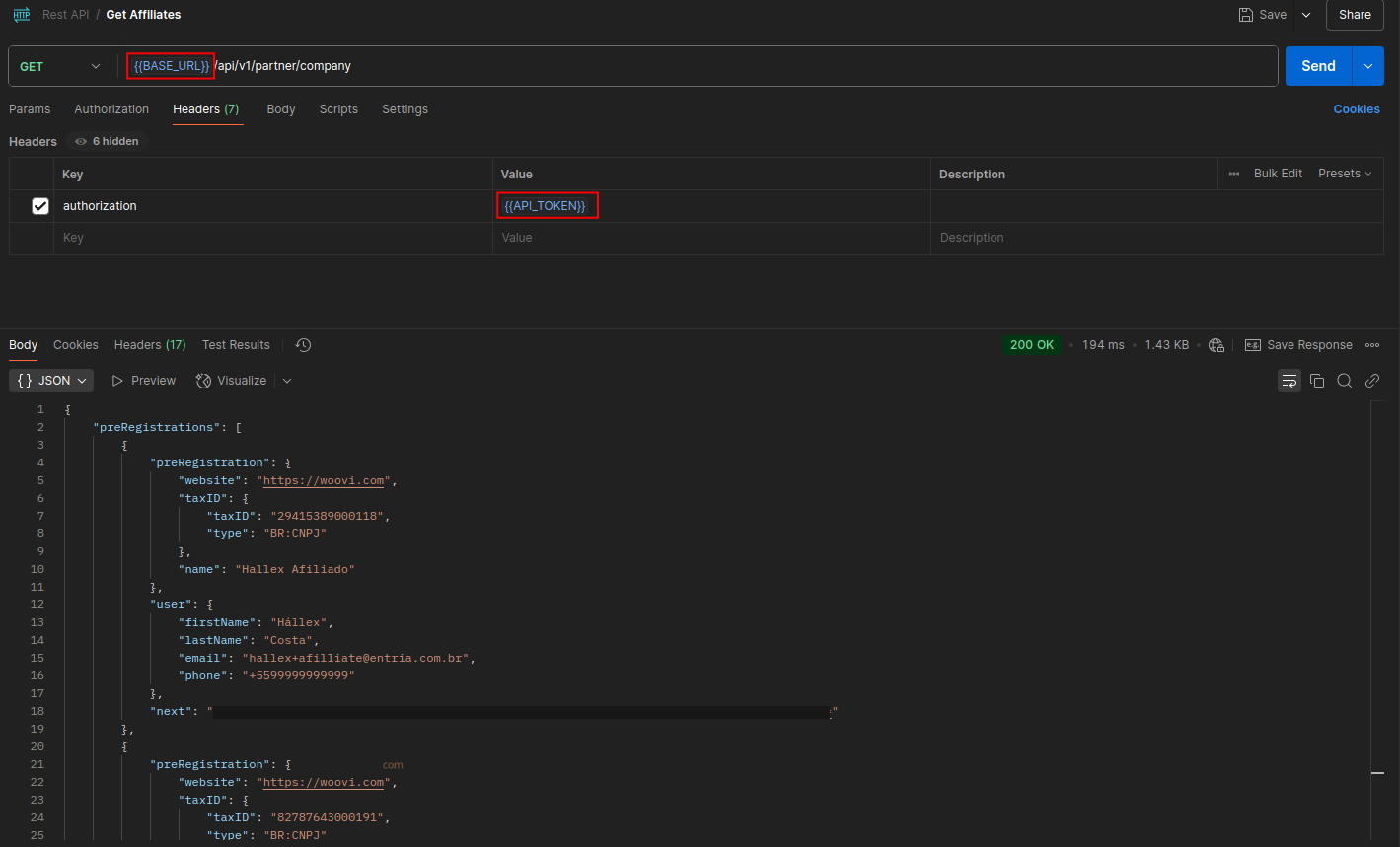 Você pode fazer um chamada para o nosso endpoint /api/v1/partner/company/{taxID} informando o seu appID no header de Authorization da sua requisição, e também substituindo o parâmetro taxID pelo CNPJ do seu afiliado pré-registrado Para saber mais sobre as especificações do nosso endpoint você pode acessar nossa documentação tecnica